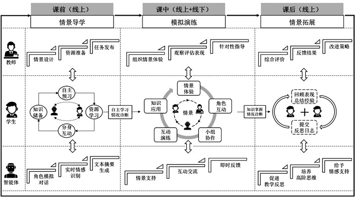 课前情景导学阶段,教师基于课程目标与教学内容,协同智能体设计个性化情景案例脚本,并推送线上学习任务与辅助资料。学生自主预习,完成初步的知识建构与情景认知。师生以数字虚拟分身的形式在特定教学情景中进行互动交流[46],从而打破虚实空间的认知壁垒。在此过程中,智能体通过角色模拟对话、实时情感识别及文本摘要生成等技术,辅助学生掌握情景主题与背景知识,激发其学习动机与探究兴趣。例如,在英语口语教学中,基于智能体的高仿真情境对话,能有效缓解英语口语焦虑[47]。课中模拟演练阶段,通常采用“教师主导—智能增强”的教学策略。教师负责设计和组织情景体验与角色模拟活动,引导学生开展小组协作与互动演练,同时对学生的表现进行观察和评估,并提供针对性的指导。智能体则负责生成与实践场景高度契合的环境、角色、情节与任务等,支持学习者对客观知识的转化与再创造,提升其实践能力和社会化水平[48]。例如,利用智能体整合法律知识与案例,并创设连贯的情境,通过沉浸式对话互动开展法律教育[49]。学习者在此阶段通过角色互动,实现认知结构的持续重构,并获得沉浸式学习体验。课后情景拓展阶段,教师和智能体共同对学生的情景模拟学习进行全面评价。智能体不仅能够促进师生对教学过程的深度反思,助力培养批判性思维和问题解决能力,更能在师生、生生时空分离的虚拟环境中为师生提供情感支持,消解时空分离可能导致的孤独感[50]。教师可结合智能体的评价报告和自身观察,对学生实施表现性评价,给予学生个性化反馈,并根据反馈结果制定后续教学的改进策略。学生则通过学习记录和反馈报告,系统审视自身在情景模拟中的行为表现,总结经验教训并撰写反思日志,以此驱动元认知能力的提升与知识整合的深化,进而提高学习成效。