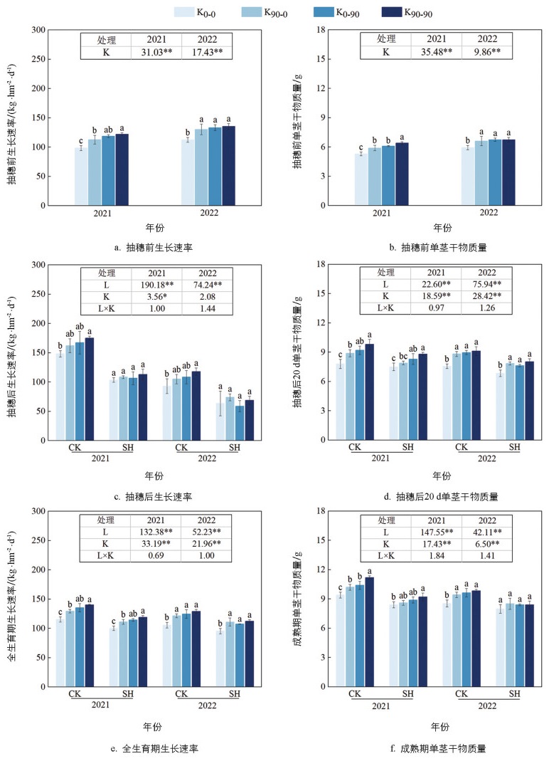 图 1表明,光照处理和钾肥运筹(除2022年抽穗后水稻生长速率外)显著或极显著影响各时期水稻的生长速率和单茎干物质量。较CK处理,SH处理显著降低了水稻抽穗后和全生育期的生长速率,导致抽穗后20 d和成熟期单茎干物质量分别显著降低了9.6%~14.9%和6.5%~17.4%。较K0-0处理,除2022年SH处理下K0-90外,钾肥运筹有效提高了两年水稻各生育阶段的生长速率,进而使抽穗前、抽穗后20 d和成熟期单茎干物质量分别增加了10.8%~21.1%、6.1%~26.3%和5.3%~18.6%。较K90-0和K0-90处理,除2022年SH处理外,K90-90处理提高了抽穗前和抽穗后水稻的生长速率,进而使全生育期生长速率提高了1.3%~8.3%。这最终使抽穗前、抽穗后20 d和成熟期(除2022年SH处理外)单茎干物质量较K90-0和K0-90处理分别提高了2.0%~9.3%、1.7%~11.5%和2.0%~9.2%。整体来看,SH处理降低了水稻的生长速率和单茎干物质量,而钾肥可促进各生育阶段水稻干物质的积累。