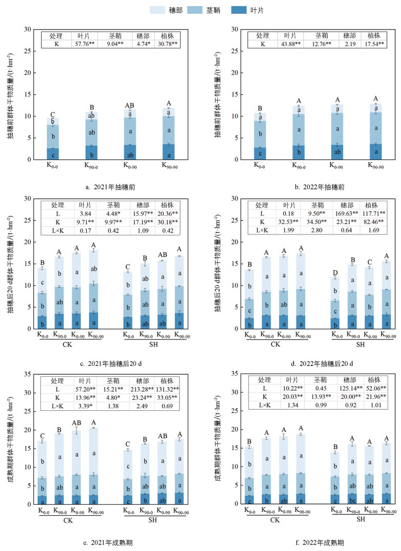 由图 2可知,光照处理(除两年抽穗后20 d叶片和2022年成熟期茎鞘外)和钾肥运筹(除2022年抽穗前穗部外)显著或极显著影响水稻各器官和植株干物质量,二者互作仅显著影响2021年成熟期叶片干物质量。较CK处理,除2022年成熟期茎鞘干物质量外,SH处理显著降低了抽穗后20 d和成熟期水稻叶片、茎鞘和穗部的干物质量,进而导致2021年和2022年成熟期水稻植株干物质量分别显著降低了13.2%~15.3%和8.8%~13.7%。与K0-0处理相比,钾肥运筹有效提高了各时期水稻各器官干物质量,使抽穗前、抽穗后20 d和成熟期穗部干物质量分别显著增加7.7%~19.5%、16.2%~39.9%和8.4%~28.0%,植株干物质量显著增加了14.6%~24.1%、14.4%~31.2%和11.2%~22.4%。较K90-0和K0-90处理,K90-90处理可有效提高各时期水稻叶片、茎鞘和穗部的干物质量,进而使2021年和2022年成熟期植株群体干物质量分别增加了3.0%~8.3%和1.3%~6.2%。较K90-0处理,除2022年抽穗后20 d和成熟期外,K0-90处理下各时期干物质量均呈增加趋势。综上可知,SH处理阻碍了植株和各器官的干物质积累,而钾肥运筹,特别是K0-90处理可有效提高不同光照条件下水稻的干物质量。