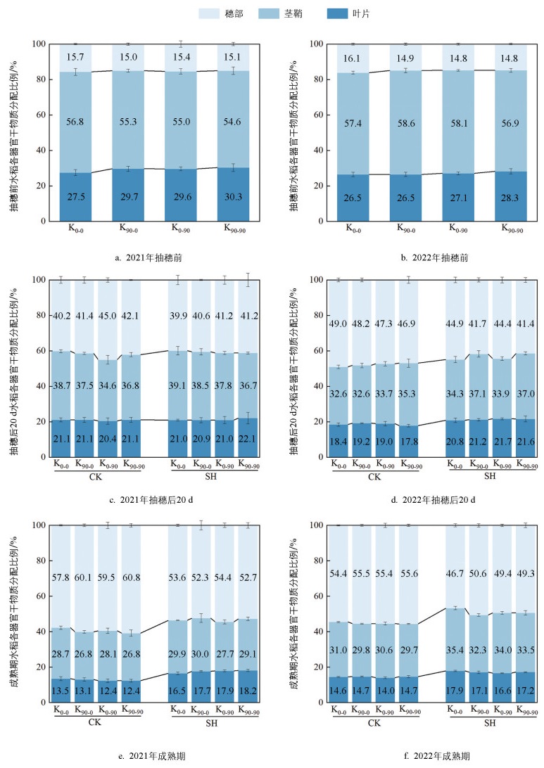随生育进程的推进,水稻叶片和茎鞘的干物质分配比例逐渐降低,穗部的干物质分配比例则呈上升趋势,且抽穗前到抽穗后20 d的上升幅度明显大于抽穗后20 d到成熟期(图 3)。相较于CK处理,SH处理提高了抽穗后20 d两年茎鞘和2022年叶片,以及成熟期两年叶片和2022年茎鞘的干物质分配比例,使抽穗后20 d和成熟期穗部干物质分配比例分别降低了0.3%~6.4%和4.2%~8.1%。钾肥运筹导致各器官干物质分配比例明显变化,但时期间存在差异。抽穗前,钾肥运筹提高了叶片干物质分配比例,但降低了穗部干物质分配比例。抽穗后20 d,钾肥运筹则降低了2021年不同光照条件下茎鞘的干物质分配比例,使穗部干物质分配比例提高了0.7%~4.8%;2022年则呈相反趋势,钾肥运筹提高了叶片(除CK处理下K90-90外)和茎鞘(除SH处理下K0-90外)的干物质分配比例,使穗部干物质分配比例降低了0.5%~3.5%。成熟期,除2021年SH处理下K90-0和K90-90外,钾肥运筹可降低茎鞘干物质分配比例,有效提高穗部干物质分配比例。整体来看,SH处理导致各时期叶片和茎鞘干物质分配比例增多,而穗部干物质分配比例减少,钾肥运筹则可提高成熟期穗部干物质分配比例。