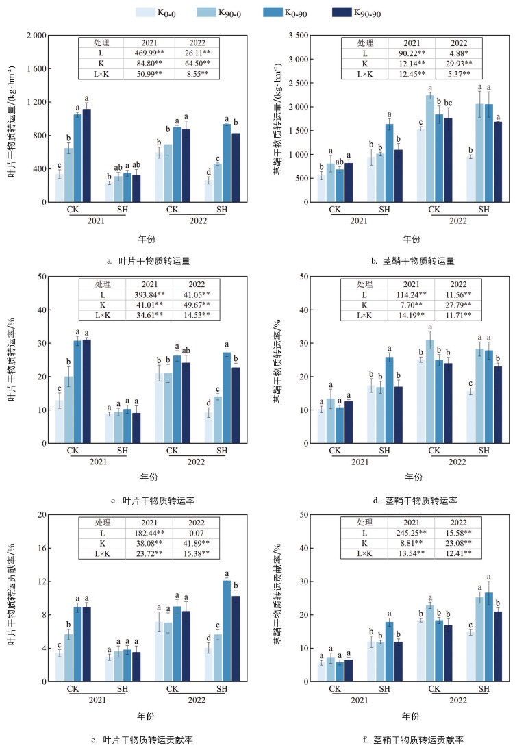 如图 4所示,水稻叶片和茎鞘干物质转运量、转运率以及转运贡献率受光照处理(除2022年叶片干物质转运贡献率外)、钾肥运筹及二者互作的显著或极显著影响。2021年,较CK处理,SH处理显著降低了叶片的干物质转运量、转运率和转运贡献率,但茎鞘干物质转运量、转运率和转运贡献率则分别显著增加了25.3%~139.8%、3.4%~15.0%和4.8%~12.0%。2022年,除K0-90处理外,SH处理导致叶片和茎鞘干物质转运量和转运率均不同程度降低;就转运贡献率而言,SH处理导致K0-0和K90-0叶片干物质转运贡献率分别降低了3.1%和1.4%,K0-90和K90-90分别增加了3.1%和1.8%,SH处理同时使茎鞘干物质转运贡献率(除K0-0外)增加了2.3%~8.3%。与K0-0相比,钾肥运筹可有效促进叶片和茎鞘储藏物质的转运再利用,使叶片干物质转运量、转运率、转运贡献率分别增加了16.4%~257.2%、0.3%~18.2%和0.6%~8.0%,茎鞘干物质转运量增加6.9%~115.6%;此外,钾肥运筹还显著增加了2022年SH处理下茎鞘的干物质转运率和转运贡献率。较K90-0,K0-90和K90-90大幅提高了两年CK处理和2022年SH处理下叶片的干物质转运量、转运率及转运贡献率。此外,较K90-0(除2022年外)和K90-90处理,K0-90处理显著提高了SH处理下茎鞘的干物质转运量、转运率及转运贡献率。综上可知,SH处理抑制了叶片干物质的转运,但增强了茎鞘干物质的转运再利用,而钾肥运筹,特别是K0-90处理可有效提升叶片和茎鞘干物质的转运再利用。