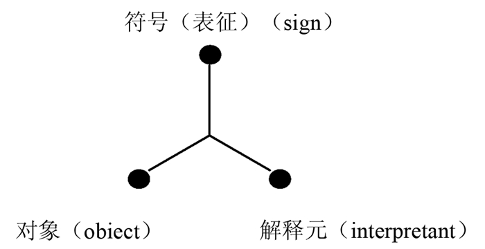 皮尔士定义的符号,具有三元合一性,即符号是由对象(object)、符号(表征)(sign)、解释元(interpretant)三元合一的。一个符号是把另外一件事物(它的对象)和一个第三者(它的意义,或者它的解释元)联系起来的东西[7]112。如图 1所示: