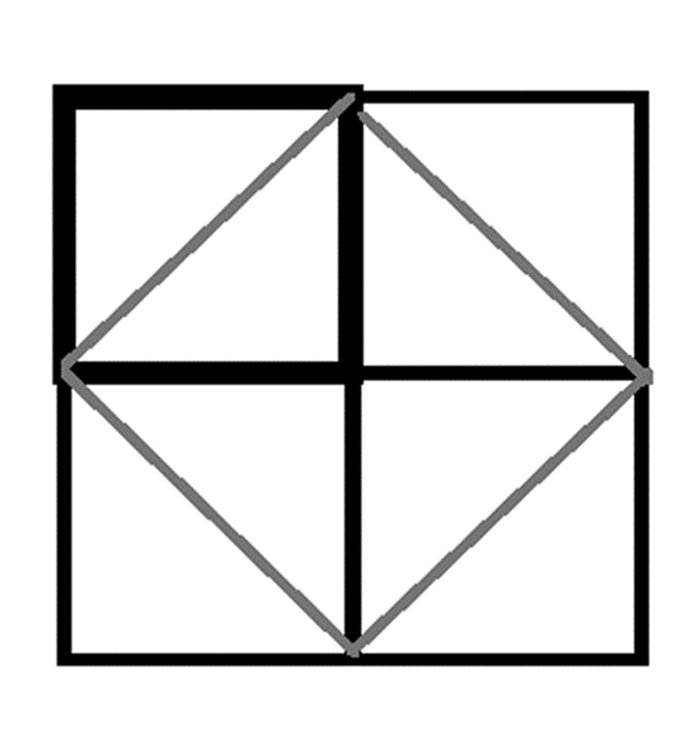 假定解答者没有勾股定理的知识,那么他可以这样开展思考并作出解答:首先,画出一个正方形,使它的面积与单位正方形的面积相同(“构建图解”环节);其次,把2个这样的正方形拼在一起,使其画出面积为单位正方形2倍的图形,由于这个图形不是正方形,进而把4个这样的正方形拼在一起组成一个大正方形(“运作图解”环节);最后,通过对图解的运作进行观察和审思,发现联结4个单位正方形的对顶点的4条线段所构成的正方形,正是满足问题要求的解,即这个正方形是2倍于单位正方形面积的正方形(“审思图解”环节)。如图 2所示: