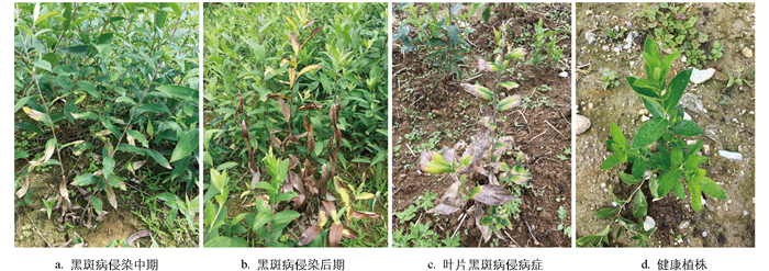 在重庆涪陵、城口、巫溪、石柱和四川甘洛、盐源、冕宁的苍术种植区中调查苍术病害的发生情况,4月下旬至5月初开始出现零星病斑,后期发病加重,发病率约在23.2%,严重时达到86.8%。田间发病的苍术(图 1a、1b)从基部开始向顶部蔓延,叶片出现黑褐色不规则病斑,逐渐向整片叶面扩展,直至整片叶片枯黄,可导致早期落叶,个别枝条枯死。一些叶片从边缘开始出现黑褐色病斑,然后向叶片内部扩展(图 1c),叶片褪绿开始变黄。