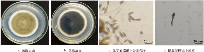 从重庆涪陵采集的越冬植株表面及四川盐源地区的发病苍术叶片上分离纯化得到4种疑似致病菌(FL2、FL4及YY4、YY7),将其接种在PDA培养基中28 ℃培养,发现两地得到的菌株,菌落形态特征基本一致,确认为同一种致病菌,培养1~2 d,外围菌丝均为白色绒毛菌落,并有气生菌丝产生,菌落的平均生长速率达11.8 mm/d,菌丝由白色逐渐变为青褐色,并形成同心圆;9 d后菌丝长满整个培养皿(图 2a、2b)。在光学显微镜下,分生孢子呈青褐色,倒棒状,倒梨状,多横隔,偶有纵隔;菌丝有横隔,长短不一,呈青褐色(图 2c、2d)。根据《中国真菌志·链格孢属》[18]记载的分类标准,将分离得到的菌株初步判定为细极链格孢(Alternaria tenuissima)、链格孢(A.alternata)、长柄链格孢(Alternaria longips)。