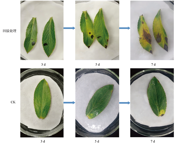 将纯化得到的YY4菌落针刺接种在健康的苍术叶片上,28 ℃皿内保湿培养,3 d后,接种的叶片开始出点褐色小斑点,逐渐向周围扩展;7 d后接种部位出现明显褐色坏死斑,发病症状与田间自然发病的苍术植株基本相同(图 3)。切取发病叶片病健交界处进行组织分离培养,获得与接种的病原菌形态特征一致的菌落,可以确定分离得到的病原菌即为苍术黑斑病的病原菌。