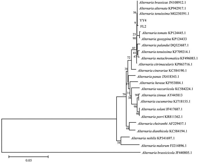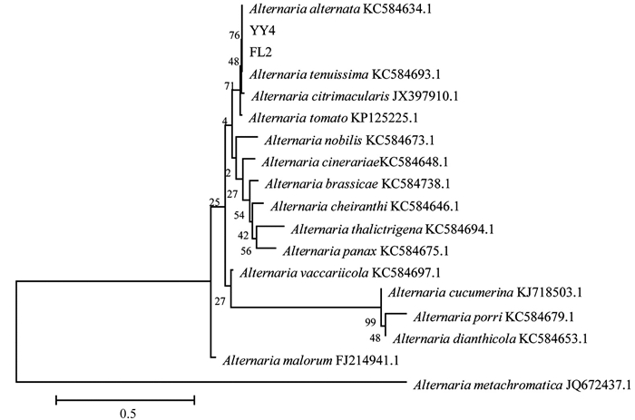 选取FL2及YY4菌株基因组DNA作为模板进行保守基因序列扩增,根据真菌通用引物ITS1和ITS4、EF-1R和EF-1F扩增出570 bp、280 bp的片段,将扩增片段测序后得到的结果提交至GenBank。利用BLAST进行同源性比较,将菌株样品的ITS序列与链格孢属(Alternaria)22种真菌的ITS序列构建系统发育树(图 4),结果显示样品菌株FL2、YY4与A. tenuissima、A. alternata、A. brassicae聚在同一分支上,且该病原菌的ITS序列与这3种菌的同源性最高可达100%。菌株样品的TEF1-α基因序列与Alternaria中16种真菌的TEF1-α序列构建系统发育树(图 5),结果表明菌株样品的TEF1-α基因序列同A. tenuissima、A. alternata、A. citrimacularis聚在同一分支上,并与A. tenuissima、A. alternata的同源性为100%。综合比对结果显示,菌株样品的ITS、TEF1-α基因序列与A. tenuissima、A. alternata的同源性更高。形态学鉴定中观察到该致病菌的分生孢子分隔处轻微缢缩,且分生孢子属于明显的长分生孢子,再结合分子生物学鉴定,判定川渝地区引起苍术黑斑病的病原菌为细极链格孢(A. tenuissima)。