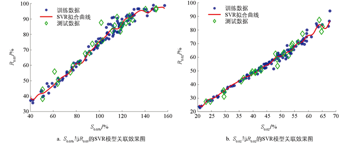 SVR模型不能直接给出拟合方程的表达式,但能够很好地捕捉变量样点间的非线性关系(图 1)。由表 5可知,使用SVR模型关联S0.05bR0.05效果相对最好。此外,一元二次方程y=-0.001 90x2+0.981 90x-4.141 30关联S0.05bR0.05效果也较好。由表 6可知,使用一元二次方程y=0.004 83x2+0.909 44x+3.639 24关联S0.02R0.02的效果最好,其次是SVR模型。