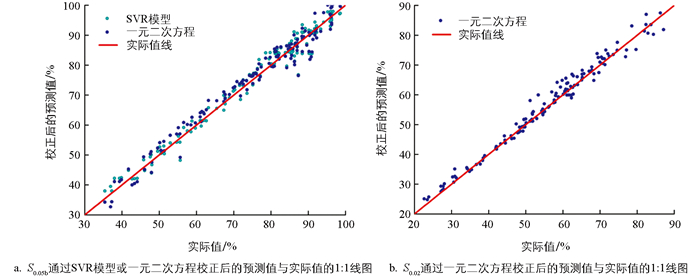 本研究绘制了关联S0.05bR0.05S0.02R0.02效果较好模型的校正结果与实际值的1∶1线图(图 2)。SVR模型校正后的S0.05b预测值大多数趋于1∶1线图附近,绝对误差较小,但有约4%的样点绝对误差位于5~8,有约1%的样点绝对误差大于8,最大绝对误差为11;一元二次方程y=-0.001 90x2+0.981 90x-4.141 30校正后的S0.05b大多数样点预测值绝对误差较小,但有约4%的样点绝对误差位于5~8,有约2%的样点绝对误差大于8,最大绝对误差为11.4;一元二次方程y=0.004 83x2+0.909 44x+ 3.639 24校正后的S0.02大多数样点预测值绝对误差较小,但有约2.7%的样点绝对误差位于5~7,最大绝对误差为6.5。