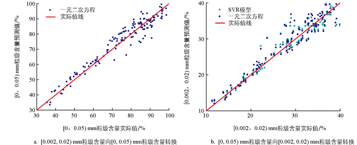 通过一元二次拟合方程y=-0.031 82x2+3.769 53x-5.763 68可实现紫色土[0.002,0.02) mm粒级含量向[0,0.05) mm粒级含量的便捷转换,但部分样点转换误差较大;通过SVR模型或一元二次拟合方程y=0.001 08x2+0.309 65x-0.481 06可实现[0,0.05) mm粒级含量向[0.002,0.02) mm粒级含量的便捷转换,转换精度较高。