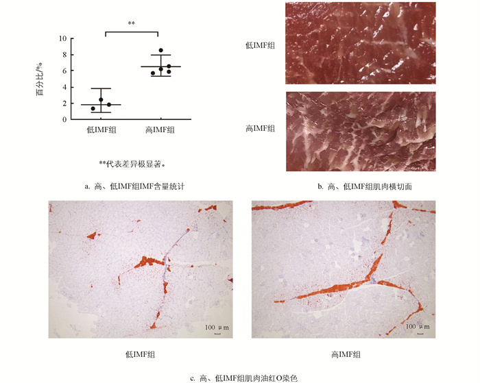 • 利用索氏抽提法进行IMF测定,依据IMF脂肪含量测定结果,分别命名为高IMF组和低IMF组,其中高IMF组平均IMF含量为6.58±1.14%,低IMF组平均IMF含量为1.87±0.55%(图 1a)。高、低IMF组肌肉横切面及油红O染色结果如图 1b1c所示,表明高IMF组肌肉组织内IMF分布比低IMF组更广。