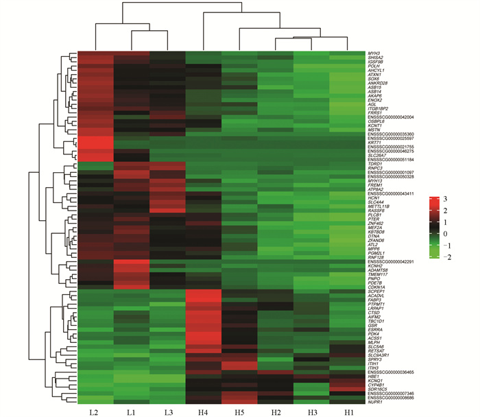 盆周山地猪是我国西南地区的优良地方猪种之一, 其开发利用对西南地区优质猪肉的供给意义重大。为了筛选盆周山地猪肌内脂肪(IMF)沉积关键mRNA和lncRNA, 利用转录组测序技术对其高、低IMF含量组的背最长肌进行分析。结果发现, 相对于高IMF组, 低IMF组中有56个mRNA显著上调, 27个mRNA显著下调, 主要涉及的相关基因有MYH3MYH13PDK4MSTNFABP3等。GO功能富集分析发现这些差异基因主要参与肌肉系统过程、脂肪酸氧化调控、肌肉器官发育等生物学过程。相对于高IMF组, 低IMF组有144个lncRNA显著下调, 93个lncRNA显著上调。差异lncRNA靶向调控413个编码基因, GO富集分析发现这些靶基因主要参与骨骼肌系统发育、脂肪细胞分化的正向调控等过程。此外, 还发现2个差异显著的lncRNA与3个差异显著的肉质编码基因(FABP3CTSDPDK4)存在潜在的靶向调控关系。