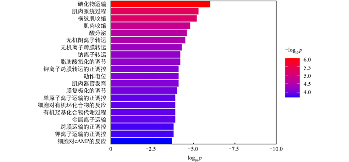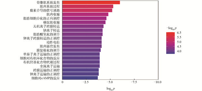 • 利用edgeR软件包进行mRNA筛选,以|log2FC|>0.75、FDR<0.05为显著表达差异条件。结果表明高、低IMF组之间共有83个差异显著mRNA,相对于高IMF组,低IMF组中有56个mRNA显著上调,27个mRNA显著下调(图 2),主要涉及的相关基因有MYH3MYH13PDK4MSTNFABP3等(图 3)。对差异表达基因进行GO条目分析发现,共有111个条目显著富集(p<0.05),主要参与肌肉系统过程、脂肪酸氧化调控、肌肉器官发育等生物学过程(图 4)。这些显著富集的GO条目中,14个与肌肉和脂肪相关,主要参与肌肉发育、脂肪酸氧化、脂肪酸代谢、葡萄糖代谢、脂质转运等过程(图 5)。KEGG功能富集分析结果表明,这些差异基因显著富集的信号通路有4个,即:甲状旁腺激素的合成、分泌和作用,胃酸分泌,糖尿病性心肌病以及胰液的分泌。