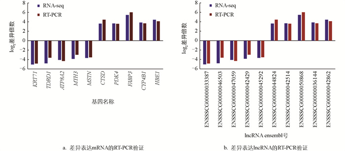 • 为了验证转录组测序结果的准确性,随机选取10个mRNA和lncRNA进行实时荧光定量PCR验证。结果发现,所验证的mRNA和lncRNA(低IMF组vs高IMF组)表达趋势与转录组测序的表达趋势(低IMF组vs高IMF组)一致(图 9),表明此次转录组测序结果可靠性高,可以用于后续研究。