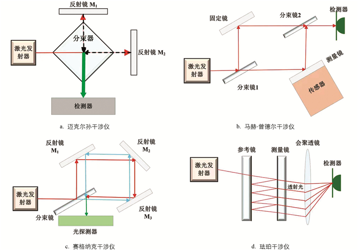 根据传感臂和参考臂干涉结构不同,干涉仪分为迈克尔孙(Michelson)干涉仪、马赫-曾德尔(Mach-Zehnder,M-Z)干涉仪、赛格纳克(Sagnac)干涉仪和珐珀(Fabry-Perot,F-P)干涉仪4种结构类型[7],具体结构如图 3所示。
