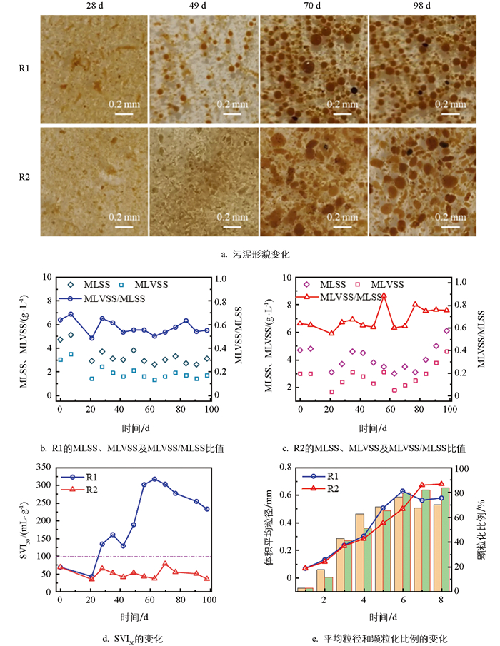 污泥形态演变过程如图 2a所示。接种污泥为黄褐色絮状污泥,运行至第28 d,R1与R2均出现颗粒化迹象,但两者演化过程存在差异。受水力剪切力作用的R1形成大量结构较为致密的条梭状污泥聚集体,而叠加“丰盛-饥饿”条件的R2则主要表现为结构相对松散的微小污泥团聚体。运行至第49 d,R1中颗粒污泥进一步成熟,出现形态较为规整的AGS;相比之下,R2的颗粒化进程仍相对缓慢。运行至第70 d,R1基本完成颗粒化,粒径较大的AGS占据主导;R2亦开始出现粒径较大的AGS,但体系中仍保留较高比例的絮状污泥。运行至第98 d,R2的颗粒化过程基本完成,絮状污泥占比显著降低。这一结果表明,在水力剪切力基础上引进“丰盛-饥饿”条件呈现明显的阶段性特征,整体颗粒化进程放缓。