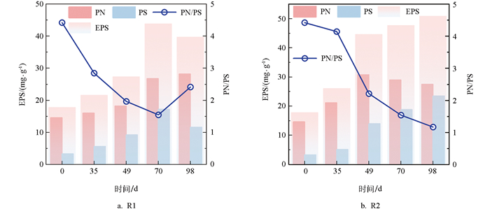 EPS作为AGS的“结构骨架”,其含量及组分变化与颗粒形成速度、沉降性和抗冲击稳定性密切相关[25]。图 3展示了R1与R2反应器中EPS组分(PN与PS)及其比值随运行时间的演变特征。以PN与PS之和表征总EPS含量,试验组R2自启动后呈持续增长态势,EPS由0 d的17.9 mg/g VSS逐步升至49 d的44.8 mg/g VSS,并在后期(70~98 d)稳定在47.8~51.0 mg/g VSS。相比之下,对照组R1的EPS虽在前期有所上升,但于70 d达到峰值(44.0 mg/g VSS)后,至98 d回落至39.8 mg/g VSS,显示出后期稳定性的不足。