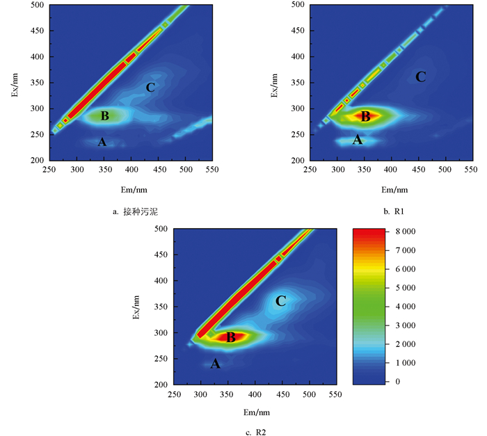 由图 4可知,接种污泥及两组反应器样品均识别出3个典型特征峰:峰A(Ex=220~230 nm,Em=330~350 nm,芳香族蛋白质)、峰B(Ex=270~280 nm,Em=320~340 nm,类酪氨酸/色氨酸蛋白质)及峰C(Ex=350~360 nm,Em=440~460 nm,类腐殖酸)[26]。各组峰位基本一致,表明由絮状向颗粒化转变过程中,EPS的核心化学成分保持稳定。进一步对比荧光强度(Fluorescence Intensity,FI)发现,在蛋白质区域,R2的FI值明显低于R1。与此同时,R2在类腐殖酸区域(峰C)表现出更强的荧光响应。
