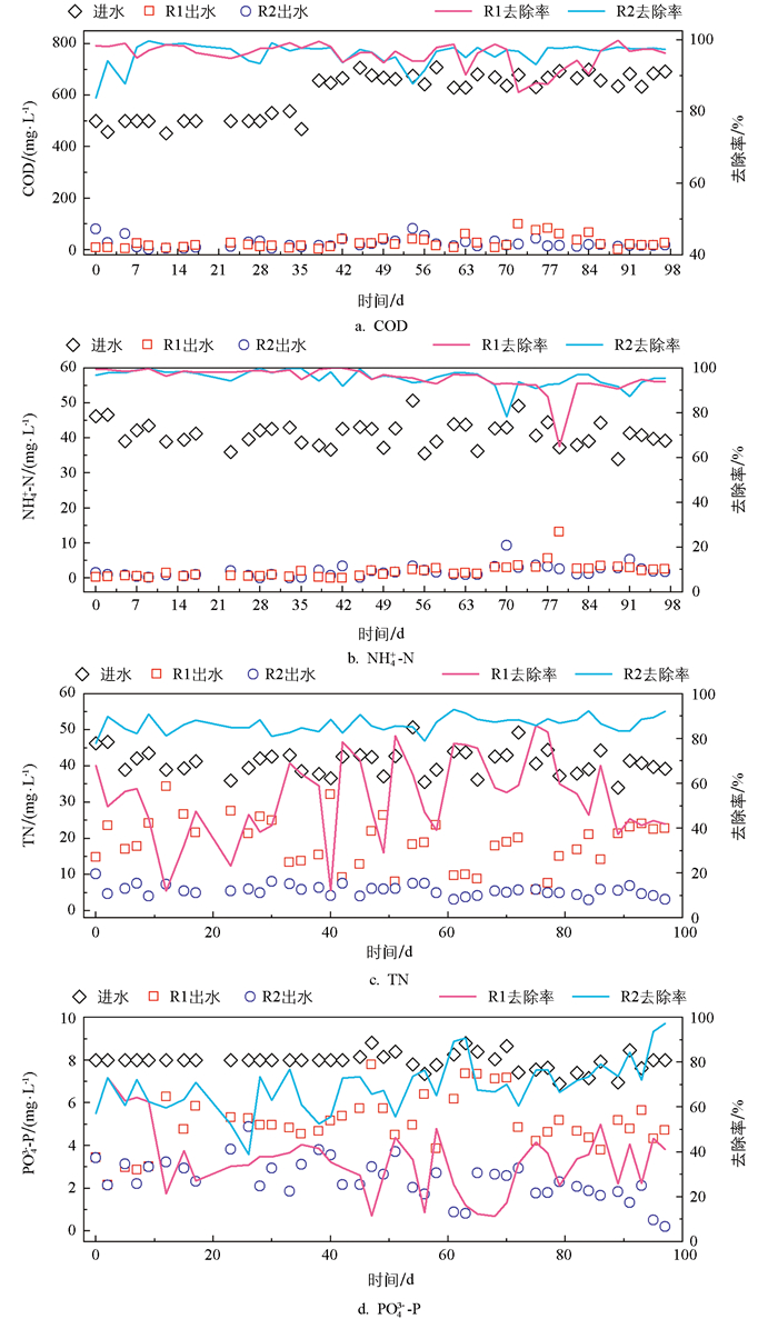 系统运行期间表现出优秀的硝化性能。前49 d,R1与R2的平均出水NH4+-N浓度分别为0.67 mg/L和0.98 mg/L,去除率均在97%以上。后期随着负荷提升,氨氧化效能略有下降,但出水NH4+-N多维持在3.00 mg/L以下,平均去除率保持在92%以上。两组出水NO2--N浓度均低于0.30 mg/L,表明系统内硝化反应进行彻底,出水TN主要由NO3--N贡献。值得注意的是,R2在脱氮效率上显著优于R1。R2的平均TN去除率为86.0%(出水平均5.73 mg/L),且运行状态稳定;而R1的TN去除率仅为53.3%,且波动幅度较大。另外,两反应器在磷去除方面表现出显著分化。运行初期(0~21 d),R2即表现出一定的除磷潜力,平均去除率为64.9%。在随后的负荷提升阶段(21~49 d),R2的磷去除率保持稳定(62.8%),而R1的去除率则骤降至34.0%(出水5.36 mg/L)。运行后期(49~98 d),R2的除磷效能稳步提升,平均去除率达到75.0%,即使在负荷攀升期亦未出现明显衰退。