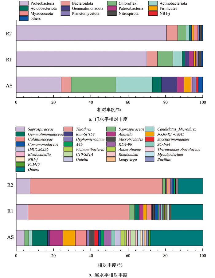 图 6展示了微生物群落结构的动态变化。与AS相比,R1和R2的优势门类发生了显著演变。接种污泥主要由变形菌门(Proteobacteria,24.12%)、绿弯菌菌门(Chloroflexi,23.99%)和放线菌门(Actinobacteriota,19.46%)组成。而在反应器运行稳定后,Proteobacteria在R1和R2中大幅富集,丰度分别升至80.60%和70.06%,占据绝对优势。Proteobacteria普遍具有降解有机物及脱氮除磷的功能,且其成员多能分泌大量的EPS,表面的脂类物质有助于微生物的聚集与黏附[28-29]。此外,硝化螺菌门(Nitrospirota)由AS中的0.043%显著增至1.25%左右,提升约28.5倍,反映了系统在较高DO条件下对硝化细菌(如Nitrospira)的有效富集。相比之下,Chloroflexi和Firmicutes等门类因其兼具厌氧特性或对易降解碳源(乙酸钠)的竞争劣势[30-31],丰度显著下降。