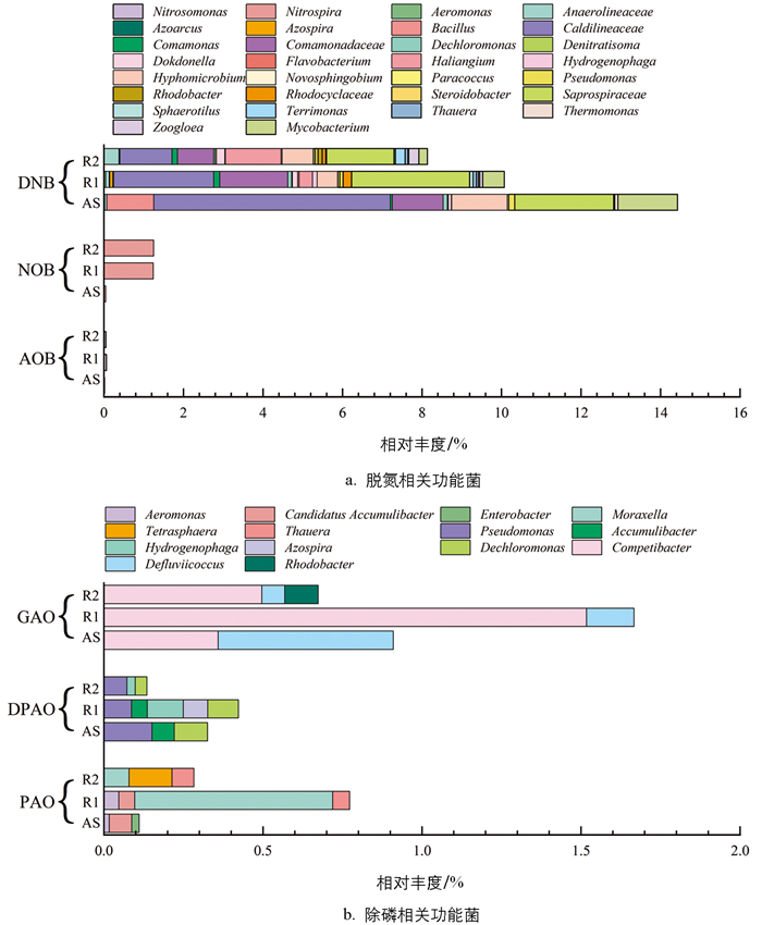 在属水平上,AS中的优势菌(如Gemmatimonadaceae等)在R1、R2中均显著退化。值得关注的是,丝状菌Thiothrix在R1和R2中均大幅增长[32],丰度分别达70.98%和54.27%。针对脱氮除磷功能菌,R1与R2中氨氧化细菌(Nitrosomonas,AOB)与硝化细菌(Nitrospira,NOB)均得到有效富集[28](图 7)。尽管在较高DO环境下,反硝化细菌(denitrifyingbacteria,DNB)总丰度较AS有所下降,但R2中9DNB的持留率(10.07%)仍高于R1(8.14%)。在除磷性能方面,R2中聚磷菌(PAOs/DPAOs)的总丰度(1.19%)显著高于R1(0.41%)。同时,R2中慢速生长微生物(PAOs、DPAOs及GAOs的总和)占比达2.86%,远超R1(1.08%)。这一结果从分子生物学层面阐明了“丰盛-饥饿”策略的优势:通过周期性的底物浓度波动,有效筛选并富集了生长速率较慢但具脱氮除磷功能的关键微生物,从而赋予了R2更优异的净化性能与长期运行稳定性。