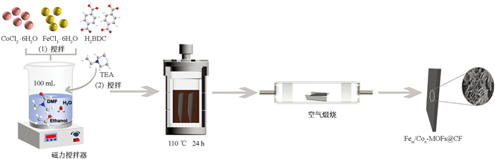 Fem/Con-MOFs@CF的原位合成:采用溶剂热法原位合成Fem/Con-MOFs@CF。如图 1所示,在100 mL烧杯中加入42 mL DMF,6 mL乙醇和6 mL超纯水,制备成混合溶液,然后将1.5 mmol H2BDC溶于混合溶液中,超声1 h后加入CoCl2· 6H2O和FeCl3· 6 H2O各1.5 mmol,随后迅速加入1.6 mL TEA至Co2+和Fe3+完全溶解,将混合物搅拌15 min,制备成均匀的胶体悬浮液,再将碳毡加入到混合溶液中。将上述溶液转移到100 mL聚四氟乙烯内衬的反应釜中,密封恒温加热至110 ℃,反应24 h。结束反应后自然冷却至室温,取出Fem/Con-MOFs@CF,用无水乙醇和超纯水清洗至溶液无色,剩余溶液进行离心处理并烘干。将所得的粉末催化剂和Fem/Con-MOFs@CF在不同温度(100、200和300 ℃)下煅烧2 h,实现对Fem/Con-MOFs材料的活化,记为Fem/Con-MOFs-T@CF催化剂(T代表温度)。在Fe和Co的摩尔比分别为1∶1、2∶1及1∶2条件下,计算FeCl3·6H2O和CoCl2·6H2O的理论用量。