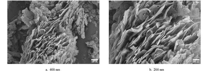 将Fe和Co摩尔比为2∶1的前驱体经管式炉200 ℃煅烧后得到的材料记为Fe2/Co1-MOFs-200。利用扫描电子显微镜(Scanng Election Microscopy,SEM)对该材料的微观结构和形貌进行表征,结果如图 2所示。Fe2/Co1-MOFs-200呈片状,展现出明晰的层状结构,表面平整光滑,片层排列规整均匀。每层纳米片的厚度为10~20 nm,层间距离为100~200 nm,样品具有较高的结晶度,尺寸均匀,表面平滑。