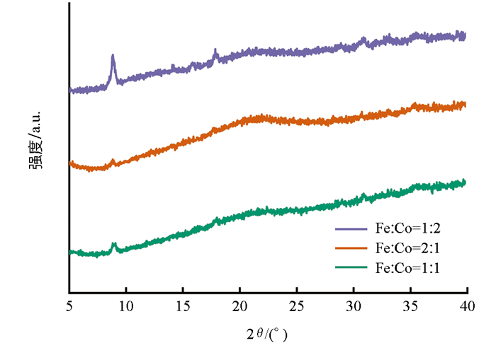 双金属Fem/Con-MOFs的X射线衍射(X-Ray Diffraction,XRD)谱图与已有研究中Fe/Co双金属MOFs的XRD谱图较为吻合,主要衍射峰位于8.86°、14.10°、15.94°和17.85°处(图 3),且衍射峰会随着Fe3+和Co2+摩尔比的变化而改变。随着Co2+摩尔占比的增大,其XRD衍射图与Co-MOFs的衍射图呈现出显著的相似性[22]。