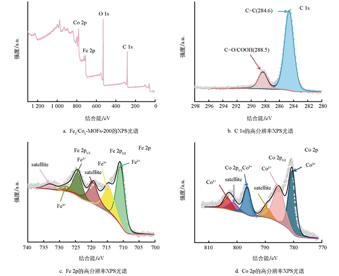利用X射线光电子能谱(X-Ray Photoelectron Spectroscopy,XPS)对Fe2/Co1-MOFs-200进行研究,以确定其表面元素组成及元素存在形式。图 4为Fe2/Co1-MOFs-200的XPS全谱以及各元素的XPS高分辨率谱图。结果显示,Co、Fe、C及O元素均存在于Fe2/Co1-MOFs-200的表面。图 4b为C 1s的高分辨率谱图,2个子峰分别对应C=C(284.6 eV)和C=O/COOH (288.5 eV)中的碳原子[27]。图 4c为Fe 2p的高分辨率谱图,主要包括卫星峰、Fe2+特征峰和Fe3+特征峰。其中,Fe 2p1/2被分为2个峰,结合能为724.3和727.8 eV处的特征峰分别对应Fe2+和Fe3+。与之类似,Fe 2p3/2也分为2个亚峰,结合能为711.0和714.5 eV处的特征峰分别对应Fe2+和Fe3+。卫星峰结合能分别为719.4和732.9 eV[28]。图 4d为Co 2p的高分辨率能谱,同Fe 2p类似,也分为卫星峰、Co2+特征峰和Co3+特征峰。Co3+在780.5和796.4 eV处的衍射峰分别对应Co 2p3/2和Co 2p1/2,Co2+的衍射峰位于803.3和785.2eV,卫星峰位于789.4和801.4 eV。