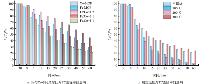 以四环素(TC)作为模式污染物,对经过不同处理的Fem/Con-MOFs@CF及其煅烧产物Fem/Con-MOFs-T@CF的污染物去除能力进行评估(图 5)。首先探究了不同Fe/Co摩尔比对催化活性的影响。如图 5a所示,当Fe和Co的摩尔比为2∶1时,Fem/Con-MOFs@CF展现出最佳降解效率,在外加60 μL H2O2的条件下,60 min内对TC的去除率接近80%。这可能是由于Co的存在促进了Fe2+/Fe3+与Co3+/Co2+的相互转化,依据金属的标准还原电位实现了双金属体系的闭合价态循环[29]。适宜的煅烧温度可显著提升催化剂的电化学性能。经低温(100~200 ℃)煅烧活化后的样品暴露出更丰富的活性位点以及更大的比表面积,为催化反应提供了更有利的条件。因此,将Fe2/Co1-MOFs@CF分别在100、200和300 ℃空气氛围下煅烧,其降解性能变化如图 5b所示。与未煅烧的Fe2/Co1-MOFs@CF相比,经100、200 ℃煅烧后的材料降解效果有了显著提升。煅烧温度为25~100 ℃时,首先蒸发物理吸附在MOFs的水分;100~240 ℃时,主要损失物理吸附的溶剂(DMF/乙醇)以及化学结合的水分子。随着温度继续升高,诱发了钴离子氧化过程,导致某些金属氧化物析出[30]。300 ℃时,材料的降解效率反而降低。综合上述实验结果,确定了Fem/Con-MOFs@CF的最佳合成条件为Fe与Co摩尔比为2∶1,煅烧温度为200 ℃,记为Fe2/Co1-MOFs-200@CF。使用该优化材料,进行后续实验。