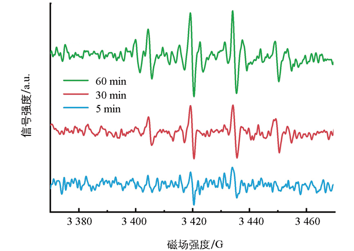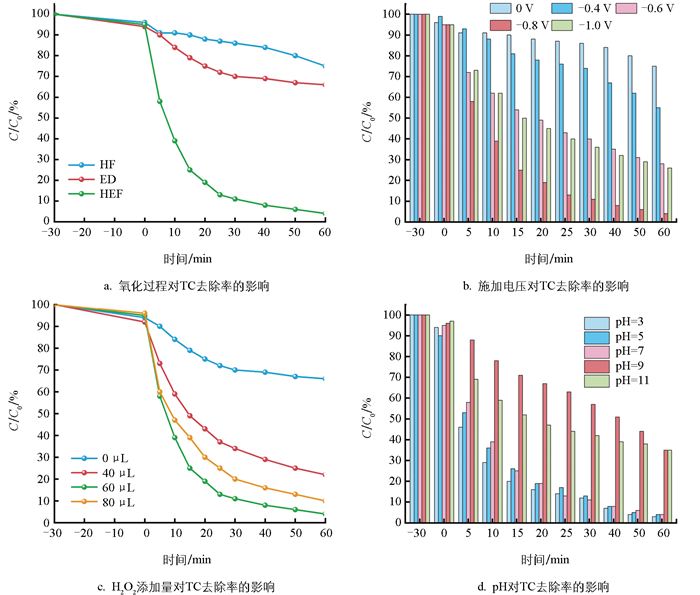 为评估以Fe2/Co1-MOFs-200@CF为阴极的HEF体系的催化性能,将非均相芬顿(HF)体系和电降解(ED)体系作为对照,探究了3个体系中TC的降解效果。其中,HF体系以Fe2/Co1-MOFs-200@CF为多相催化剂,用于活化H2O2;ED体系仅通电,不外加H2O2,以Fe2/Co1-MOFs-200@CF为阴极。由图 6a可知,HEF体系可在60 min内达到96%的TC去除率,而HF和ED体系在相同时间内的去除率分别为25%和34%。为深入揭示操作参数对HEF系统Fe2/Co1-MOFs-200@CF降解TC的影响,系统研究了电压、pH值以及初始H2O2添加量对降解过程的作用机制。如图 6b所示,改变外加电压能够优化Fe2/Co1-MOFs-200@CF对TC的降解效果。当施加电压为-0.8 V时,TC的降解速率最快,这可能是由于Co2+/Co3+与Fe2+/Fe3+的氧化还原循环促进了·OH的连续产生,从而加快了TC的降解速率。当电压达到一定阈值时,过高的电压会加剧水的电解过程,产生氢气和氧气,增加了电能的消耗[31]。H2O2添加量对TC降解效率的影响如图 6c所示,随着H2O2添加量从40 μL增加到60 μL,分解产生的·OH增加,TC去除速率加快,但当添加量增加为80 μL时,降解速率略有下降。这可能是由于过量的H2O2与·OH反应,H2O2既参与了·OH的产生,也参与了其消耗[32]。综合考虑环境因素和H2O2成本,确定60 μL为最佳添加量。图 6d为不同pH值条件下TC的降解情况,在pH值为3、5、7、9和11时,TC的降解效率分别为97%、96%、96%、65%和65%。碱性条件下降解效率下降,主要是由于HO2-的生成消耗了·OH[32]。总体而言,Fe2/Co1-MOFs-200@CF在pH值为3~11时均具有良好的催化作用,突破了传统芬顿反应的pH限制。