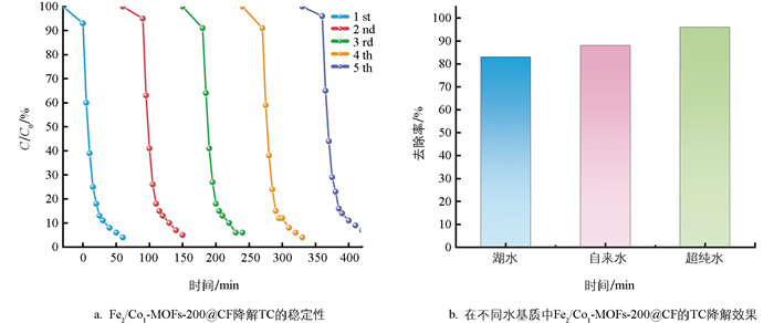 催化剂的稳定性和可重复使用性是评估其在HEF系统中催化性能的关键指标。由图 7a可知,Fe2/Co1-MOFs-200@CF经过5次循环降解实验后,仍保持较高的催化活性,在相同的反应条件下,TC的去除率仍可达93%,表明其具有良好的可重复使用性。碳毡本身优异的三维结构稳定性,结合Fe与Co双金属中心的设计,共同为该复合材料的结构稳定性提供了保障[33]。为进一步评价其实际应用潜力,以北京紫竹院公园湖水和自来水为水基质,探究Fe2/Co1-MOFs-200@CF在HEF体系中对TC的降解效果。如图 7b所示,反应60 min后,TC在湖水和自来水基质中的去除率分别为83%和88%,表明HEF体系中,Fe2/Co1-MOFs-200@CF对不同类型实际水体中的TC均有很好的降解效果。