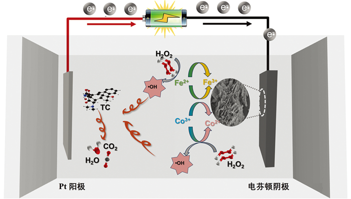 人类活动导致的水污染已成为全球范围内日益严峻的环境问题[1]。20世纪以来,全球抗生素生产增长迅速,其来源也由天然产物逐步转向人工合成[2],抗生素在人类活动中的应用愈加广泛。在众多抗生素中,四环素(Tetracycline,TC)因抗菌活性优异、副作用少、价格低廉,成为人类和动物临床治疗中应用极为普遍的广谱抗生素之一,常用于治疗由细菌、立克次体、支原体及衣原体引起的感染性疾病[3-4]。然而,人体或动物对四环素的吸收量仅占使用总量的一小部分,大部分四环素可通过粪便和尿液排出体外进入环境,从而引发一系列环境问题[5-6]。四环素对水生生物表现出毒性作用,影响其生长、繁殖及行为,扰乱水生生态系统的稳定性。此外,饮用水源中残留的四环素经人体摄入后长期积累,可导致肠道菌群失衡、过敏反应等健康问题[7]。因此,开发一种高效去除水体中四环素污染物的技术显得至关重要。芬顿氧化法是高级氧化法(Advanced Oxidation Processes,AOPs)的一种,1894年由H.J.H. Fenton首次提出[8],近年来在水处理领域发展迅速。传统均相芬顿法借助Fe2+与H2O2反应生成强氧化性的自由基,但存在对H2O2利用率低、反应条件严苛及二次污染(铁污泥)等问题[9]。为克服上述局限,研究者提出了异相电芬顿(Heterogeneous Electro-Fenton,HEF)技术。该技术可利用含有催化活性成分的固体催化剂代替金属离子活化H2O2,产生大量强氧化性的自由基[10]。相较于传统均相芬顿,HEF能避免污泥产生和铁浸出,且催化剂可回收并循环使用,具有明显优势。当前,HEF领域的研究热点是利用金属、双金属和非金属材料开发稳定、环保且具有高催化活性的阴极材料[11]。研究表明,HEF的催化活性主要受限于Fe2+/Fe3+循环效率[12],因此,通过材料优化提高Fe2+/Fe3+循环效率,有望提升电极的催化活性。此外,pH适用范围窄是限制HEF应用的另一个重要因素,铁离子析出是导致其pH适用范围窄的主要原因,通过引入螯合剂或配体,使其与Fe2+/Fe3+配位,可避免铁离子的析出[13],从而拓宽其pH适用范围。