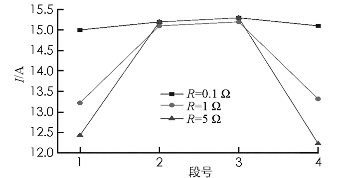 从图可得,当杆塔接地电阻R位于输电线路的中间档距时,架空地线中的电流I变化很小,接地电阻R对电流I几乎没有影响.当杆塔接地电阻R位于输电线路的两端时,随着接地电阻R的增大,架空地线中的电流I随之减小.当杆塔接地电阻R减小到一个较小的值(0.1 Ω)时,接地电阻R对电流I的影响降到最低,输电线路上各段电流几乎相同.这是由于OPGW与杆塔和大地形成网状回路,除去首末两端的杆塔,其余的杆塔均被相邻的网状回路中一起使用.在两个相邻的网状回路中,每个杆塔上流过的电流大小相同,方向相反,所以在杆塔中流过电流实际为零.而在首末两端的杆塔上,其被一个网状回路使用,杆塔中有电流流过,改变杆塔接地电阻R的大小,杆塔中流过的电流也会随之改变.