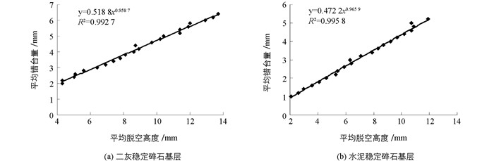 未设传力杆时,二灰稳定碎石基层和水泥稳定碎石基层的错台量与脱空高度调查资料如图 3所示.分析可知:脱空高度处于同一水平时,二灰稳定碎石基层错台量要比水泥稳定碎石基层大10%~20%,这说明水泥稳定碎石基层的抗冲刷性能较二灰稳定碎石基层好;平均错台量均随着平均脱空高度的增加呈乘幂关系增大,对两者进行拟合,其回归公式为