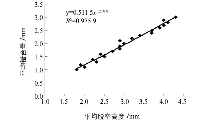 分析图 4可知:虽然水泥稳定碎石基层上设传力杆的水泥面板仍然会出现脱空及错台现象,但其程度均比未设传力杆时大大降低,设传力杆时最大脱空高度仅为4.3 mm,最大错台量为3.0 mm,未设传力杆时最大脱空高度为11.9 mm,最大错台量为5.2 mm,而且基本上没有出现断板现象,这充分说明传力杆控制脱空与错台效果显著.对脱空高度与错台量进行回归,得到公式如下: