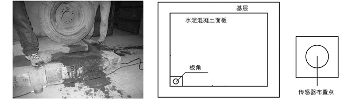 错台量是指水泥混凝土路面相邻接缝或裂缝间的相对高差值[3].路面平整度随着错台量的增大而增大,相应的板底冲刷脱空也就越严重.选取广西地区的二灰稳定碎石类和水泥稳定碎石类两种基层进行错台量调查,检测仪器为数显胎纹仪,结合现场车辆行驶的轮迹分布情况,选择的3个测量位置分别是距离板边50 cm和170 cm两点和离路中心50 cm的点,如图 1所示.错台量有正负之分,车辆的驶入方向板比驶出方向板高时为正,反之为负,如图 2所示.