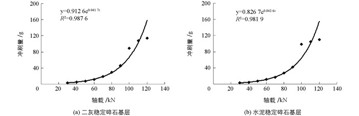2) 在室内修筑基层脱空的水泥混凝土路面结构,分析不同行车荷载与冲刷量的关系,表明冲刷量与轴重呈指数关系,二灰稳定碎石基层的冲刷量比水泥稳定碎石基层的冲刷量大10%~12%,并建立任意轴载下冲刷脱空模型.