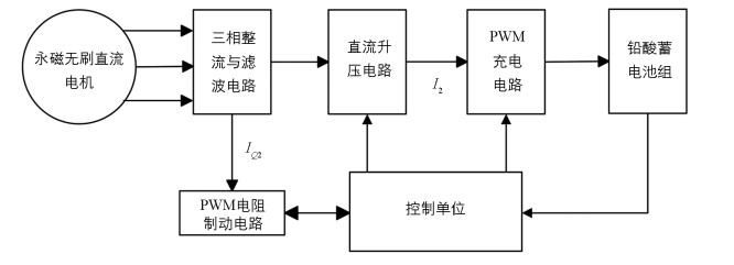 混合动力三轮摩托车制动能量回收系统如图 1所示.电磁制动采用铅酸蓄电池充电制动和电阻制动两种模式.电阻制动用于当电磁制动电流大于蓄电池可接受充电电流时与蓄电池充电制动进行联合制动.
