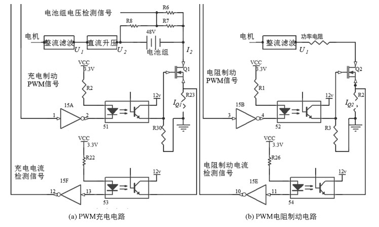 系统电控部分主要包括三相整流滤波电路、直流升压电路、PWM充电电路、PWM电阻制动电路等. PWM充电电路与PWM电阻制动电路如图 2所示.充电电路利用PWM信号控制功率管Q1的导通与截止的时间来控制流过功率管Q1的电流大小;电阻制动电路利用PWM信号控制功率管Q2的导通与截止的时间来控制流过功率电阻的电流大小.为避免大电流窜入控制单元,两电路均采用光电耦合器将控制芯片与大电流回路隔离.