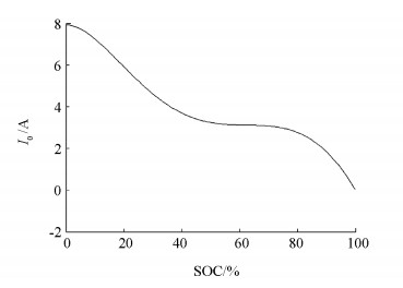 式中:I为蓄电池可接受的充电电流;Io为蓄电池初始的可接受的充电电流;a为衰减率常数,a=I0/C,C为需要充电的电池容量;t为充电时间.在实际工作中,可以依据电池的SOC(蓄电池荷电状态)选择最佳I0[12],SOC值在实际应用中可考虑用蓄电池组开路电压确定.结合文献[13]的数据结果,使用最小二乘法拟合可得到不同SOC下的I0,拟合曲线如图 4所示.