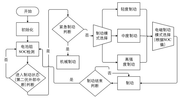考虑制动安全,需要判断是紧急制动还是非紧急制动,其方法是检测制动操作机构的加速度.紧急制动时直接采用机械制动,但需防止出现侧滑、跑偏和失去转向能力等.非紧急制动时根据制动强度,合理分配电磁制动力矩与机械制动力矩的比例,并将制动能量回收的模式分为轻度制动、中度制动、高强度制动3种模式[7].