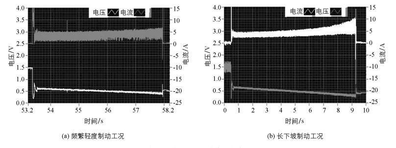 轻度制动模式实验分频繁轻度制动及长下坡制动两种制动模式.由图 6知,频繁轻度制动能量回收时,电机输出电流较稳定,电压平稳降低,无较大幅度波动,能够提供一个稳定的制动力矩;长下坡制动能量回收时,电机输出的电流略微增加,电压平稳下降,这与制动过程车速逐渐降低状况一致.实验表明,轻度制动能量回收时,系统能够实现平稳制动.