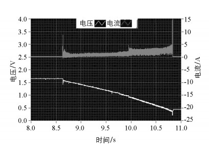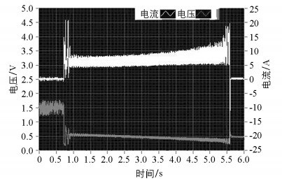 中度制动模式实验结果如图 7所示.与轻度制动能量回收相比,电机的输出电流增大,即制动力矩增大;制动开始瞬间电机电流有较大幅度变化,但整个制动过程电流变化相对平稳,在实验中车身无大幅抖动现象发生.