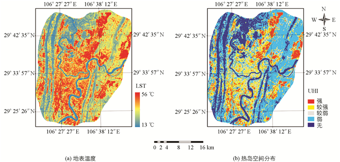 从图 2可以看出,城市热岛整体呈现出带状分布,热岛的中心主要位于3条山脉中间人群和建筑比较密集的大渡口区、渝中区等.但可能由于河流对于热岛所起的部分缓解作用,导致主城区的主要热岛效应呈较强而非强的状态.中梁山、铜锣山以及长江、嘉陵江所分布的区域呈弱热岛或者无热岛效应.由此看出,研究区域中不同地理要素的空间分布对城市热岛的空间分布产生了明显的影响,而由于研究区域中各种地理要素的空间位置错综复杂,这也导致城市热岛呈现出复杂的空间异质性.