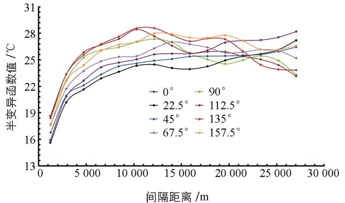 根据半变异函数的计算公式(4)可知,函数值在很大程度上依赖于各方向上间隔距离为h的像素点对的差值.而在整个研究区域,城市建筑、主要山脉以及河流的分布大致都沿着0°~22.5°方向,也就说在这些方向上,随着间隔距离h的逐渐增大,点对中像素点之间的差值的变化是稳定的,导致在这些方向上半变异函数曲线的变化较为平稳;相反,在与其相垂直的90°~112.5°方向上,由于山脉的阻隔,高低温交错分布,导致其随着间隔距离h的增大,点对温度差值的变化随机性较大,因此,在这些方向上半变异函数曲线的波动较明显,且复杂.