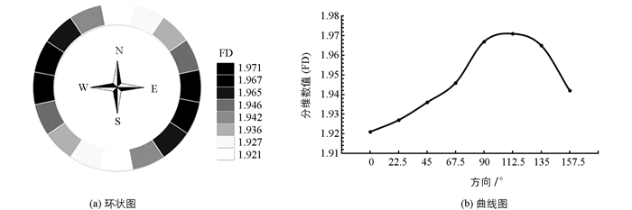 从图 5中可以看出,在0°方向上,分维数为最小值1.921,而当方向旋转到112.5°时,分维数达到最大值1.971,曲线整体呈现出一个先升高后降低的变化趋势.各向分维数值的大小可以表示该方向上空间变异的复杂程度,也就证明了研究区域中城市热岛的空间分布存在明显的各向异性,而且在0°方向上变异最简单,随着方向的旋转,变异的复杂度在逐渐增大,旋转到112.5°方向时变异的复杂度达到最大.此结果与前文中各向半变异函数所表现出的结果相一致,即在0°~22.5°方向上呈现出简单的变异性,在90°~112.5°方向上呈现出复杂的变异性.