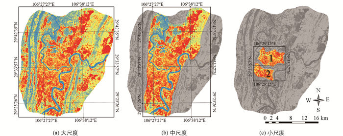 实验中,划分出3种尺度,分别为大、中、小,如图 6所示.大尺度(L)包括整个研究区域,目的是探测多因素下城市热岛的空间变异(图 6(a));中尺度(M)包括嘉陵江和长江,以及城市建筑区域,目的是探测除山脉以外的多因素下城市热岛的空间变异(图 6(b));小尺度仅包括建筑区域,目的是探测建筑对城市热岛空间变异的影响,为了避免城市建筑的区域性差异对实验结果的影响,在小尺度下共选取了2个样本区域(c1,c2)进行实验(图 6(c)).