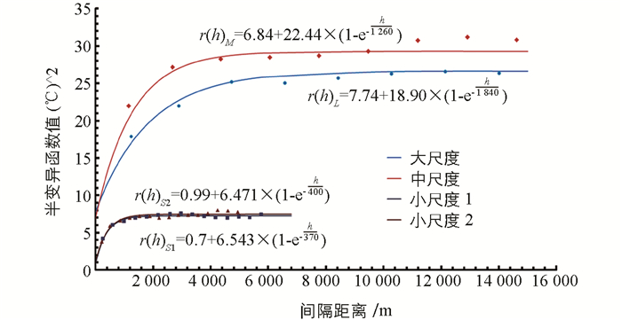 在大尺度下半变异函数表现出了块金效应,块金值为7.74.通常,出现块金效应有2种原因:①存在更小尺度上的变异性;②样本分析中存在误差.本文为第一种原因,表明存在小尺度上的变异.基台值为26.64,反映出其空间变异的幅度.块金基台比(块金值与基台值的比值)可以反映系统变量空间相关性的程度,通常,块金基台比小于25%表示强烈空间自相关,大于75%表示空间自相关性比较弱.本文块金基台比为29.05%,表明整个研究区域城市热岛的空间自相关性处于较强的水平.之外还发现,随着尺度的减小,块金值在逐渐减小,块金基台比也在逐渐减小.结合图 7可以更加直观地看出各尺度下变异函数之间的3个明显的异同点:第一点:2个小尺度下的实验半变异函数曲线几乎重叠;第二点,大尺度和中尺度下的块金值和基台值差异较小;第三点,小尺度下的基台值近似等于大尺度和中尺度下的块金值.
