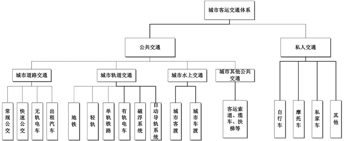 所谓消费者行为(Consumer Behavior),又被叫做顾客行为(Customer Behavior),是指消费者为获取、使用、处置消费物品或服务所采取的各种行为和执行决策的过程[11].一般消费行为包括几个阶段,研究者们把消费的几个阶段分为认识问题、信息收集、评价决策、购买行为和反馈评价行为,本文基于以上5个阶段来分析出行者消费行为和交通工具选择的关系.在城市交通体系中存在部分不属于消费行为的交通方式,城市交通体系结构如图 1所示.